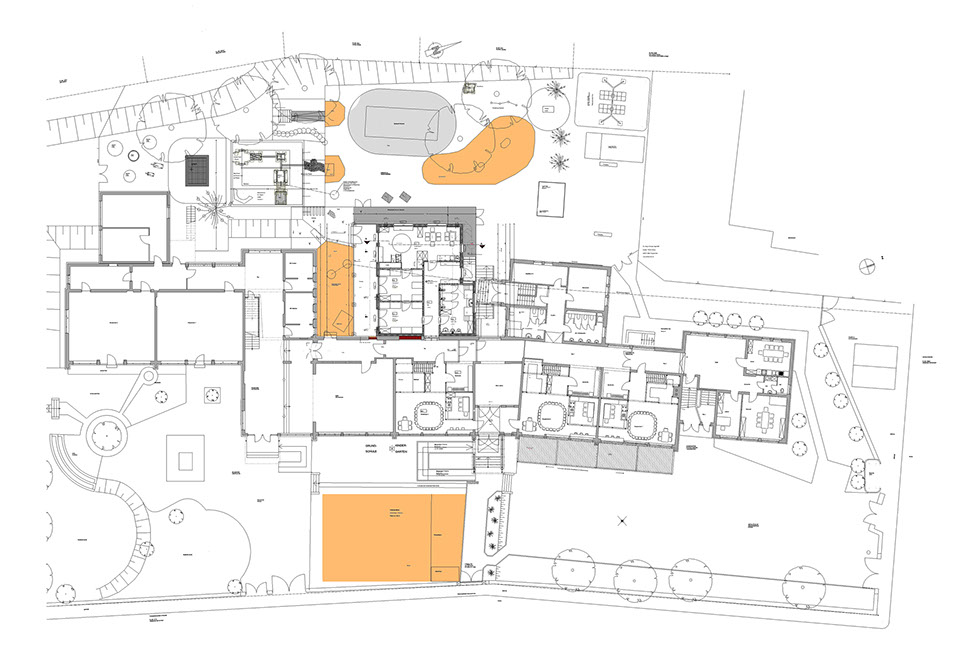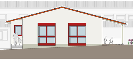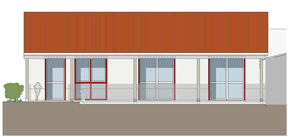 Anbau einer zweiten Kleinkindgruppe an den bestehenden Kindergarten Retzstadt als eingeschossiger Holzrahmenbau auf Bodenplatte mit überdachter Terrasse und Neugestaltung der Außenanlagen.